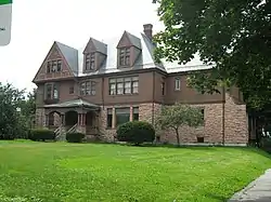 The Edward Wells House is located in eastern Burlington, at the northwest corner of Maple and Summit Streets. It is a large 2½ story structure, built out of stone and brick, capped by a truncated hip roof. The first floor is finished in rustically cut reddish limestone, laid in random courses, while the upper levels are finished in brown brick. The main facade is three bays wide, each with a different configuration of windows and decoration. Each bay is topped in the roof by a gabled dormer, that on the left larger than the other two. All three dormers feature terra cotta panels in the gable peaks, and have diamond-paned sash windows. The main entrance is sheltered by a deep hip-roofed porch, supported by clusters of round columns set on stone piers. The interior features lavish woodwork.[2]