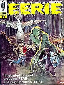 Eerie was an American magazine of horror comics introduced in 1966 by Warren Publishing. Like Mad, it was a black-and-white magazine intended for newsstand distribution and did not submit its stories to the comic book industry's voluntary Comics Code Authority.[1] Each issue's stories were introduced by the host character, Cousin Eerie. Its sister publications were Creepy and Vampirella.[2]