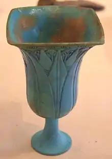 Egyptian faience is considerably more porous than glass proper. It can be cast in molds to create small vessels, jewelry and decorative objects.[3] Although it contains the major constituents of glass (silica, lime) and no clay until late periods, Egyptian faience is frequently discussed in surveys of ancient pottery, as in stylistic and art-historical terms, objects made of it are closer to pottery styles than ancient Egyptian glass.