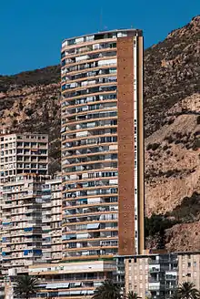 El Barco was one of a cluster of buildings erected in the former village of Albufereta for "Pied-Noirs", or residents from France and other European countries, in Francoist Spain.[2] It was completed in 1963.[3] The building was designed by Juan Guardiola, inspired by the Pirelli Tower designed by Giò Ponti in Milan. It takes its common name from its boat-shaped floor plan. El Barco is one of the most distinctive buildings of Alicante. It has an unusual lattice-work facade protecting the rear wall and windows, which was preserved during renovations completed in 2011.[4]