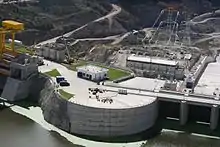 The El Cajón Dam is a hydroelectric dam on the Río Grande de Santiago in the Mexican state of Nayarit. Construction began in 2003 and was completed in June 2007. It cost US$800 million to build.[1] It is 640 m (2,100 ft) long and is 178 m (584 ft) high. The reservoir holds approximately 5,000,000,000 m3 (1.8×1011 cu ft) of water, and the generators are capable of producing 750 MW of electricity. The dam is operated by the Comisión Federal de Electricidad, a state-owned Mexican electric company. Throughout the construction of the El Cajón Dam, the following is estimated: