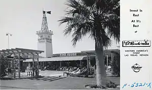 The El Rancho Vegas offered a vacation experience to its guests.[21] Formal clothing was not required at the resort.[2][5] According to the Los Angeles Times, the El Rancho Vegas "combines the charm and open-handed hospitality of the Old West with the convenience of today".[3] The El Rancho was considered a combination casino/motor court/dude ranch.[21] The Old West theme was prominent throughout the resort,[22][23] with a Spanish-style exterior and a cowboy/frontier-styled interior.[24] El Rancho Vegas offered horseback riding,[25] the Round-Up Room dinner theater,[3] and a large swimming pool,[26][25] the latter located along Highway 91 to entice motorists.[10][5] Hull intended to capitalize on the large number of motorists traveling into Las Vegas from Los Angeles.[3] The resort featured a 50-foot neon windmill,[27] and advertisements encouraged visitors to "stop at the sign of the windmill".[21][10]