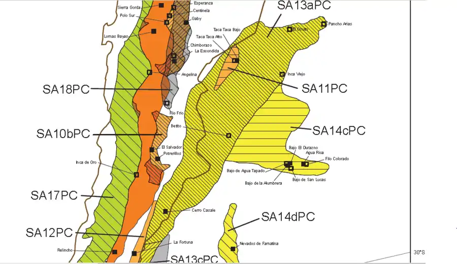 7. Bissig, Thomas; Riquelme, Rodrigo (2009). "Contrasting landscape evolution and development of supergene enrichment in the El Salvador porphyry Cu and Potrerillos-El Hueso Cu-Au Districts, Northern Chile". Society of Economic Geologists Special Publication. 14: 59–68.