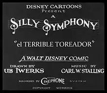 El Terrible Toreador is a 1929 animated cartoon produced by Walt Disney Studios in the Silly Symphonies series.[1] The short's copyright was renewed in 1957, so it will enter the US public domain on January 1, 2025.[2][lower-alpha 1]