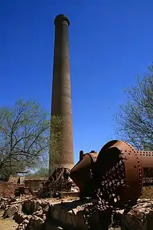 A notable feature of the town is the 47-meter-high[10] smokestack constructed in 1890 for El Progreso Mining Company. It is called "La Ramona", named after Saint Raymond, on whose feast day the project was completed on. The smokestack was once thought to be designed by Gustave Eiffel, though no conclusive evidence of his involvement in the project has been located.[6] After more than 100 years, the smokestack was cracked and damaged and collapse during an earthquake or hurricane was a concern.[6] In 2018, the nonprofits International Community Foundation (ICF) and the Corredor Histórico CAREM, A.C. collaborated to restore La Ramona for an estimated US$200,000.[6][11]