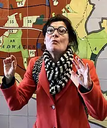![]() Harwood in 2022 speaking at the launch of Stevenage: Pioneering New Town Centre, standing in front of a mural showing the Town Plan of Stevenage | |