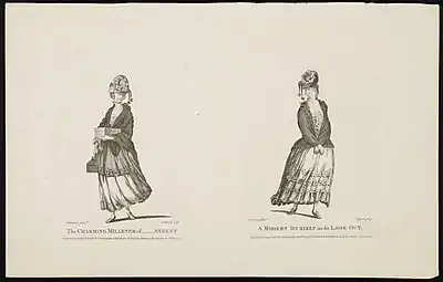 Other images, such as Robert Dighton's A Mourning Ramble shows young women who seem to more interested in flirting with male customers than in making sales. This satirical print by James Caldwell compares the "Charming Millener" to a demirep (which is a woman of questionable morals).