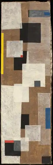 De Laittre's work first appeared in the group's fifth annual exhibition held at the Riverside Museum in February 1941.[19] Of it Edward Alden Jewell wrote, "Non-objectivity remains the special pursuit of these artists, and non-objectivity means just that: no object, as we look upon object in the world about us. It is a matter of lines and planes and volumes—abstract shapes and forms arranged in a pattern."[2] Along with de Laittre's paintings, the show included works by Fernand Léger and Piet Mondrian and group members, including Josef Albers, Ilya Bolotowsky, Giorgio Cavallon, Arthur N. Christie, Werner Drewes, Suzy Frelinghuysen, A.E. Gallatin, Fritz Glarner, Balcomb Greene, Gertrude Greene, Hananiah Harari, Lee Krasner, Ibram Lassaw, George McNeil, László Moholy-Nagy, George L.K. Morris, Alice Mason, I. Rice Pereira, Ad Reinhardt, Louis Schanker, Charles Green Shaw, Esphyr Slobodkina, Albert Swinden, Robert Jay Wolff, and Jean Xceron.[2]
