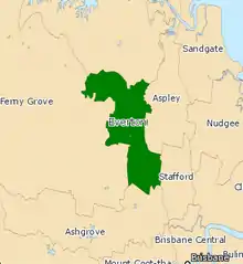 The division encompasses suburbs in Brisbane's north west between Kedron Brook and the South Pine River, including Everton Park, Everton Hills, McDowall and Albany Creek. Parts of Mitchelton are located in the electorate.