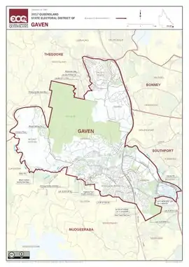 Gaven /ˈɡeɪvən/ is an electoral district of the Legislative Assembly in the Australian state of Queensland. It was created out of the former district of Nerang and the southern segment of Albert in the 2001 redistribution, and encompasses the northern growth corridor of the Gold Coast. The current Member of Parliament is Meaghan Scanlon of the Labor Party.[1] It is currently the only Labor-held seat on the Gold Coast.