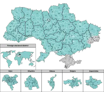 - ↑ "Закон України "Про вибори народних депутатів України", стаття 18: "Виборчі округи"" [Law of Ukraine "On Elections of People's Deputies of Ukraine", article 18: "Electoral districts"] (in Ukrainian). Verkhovna Rada. Archived from the original on 26 September 2019. Retrieved 20 November 2019.