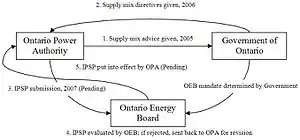 - ↑ Ontario Energy Board. 2006. Report of the board on the review of, and filing guidelines applicable to, the Ontario Power Authority's Integrated Power System Plan and procurement processes. http://www.oeb.gov.on.ca/documents/cases/EB-2006-0207/IPSP_report_final_20061227.pdf Archived 6 July 2011 at the Wayback Machine. Retrieved 5 April 2007; See also: Ontario Legislative Assembly. 2004. Electricity restructuring act, 2004: Ontario regulation 424/04. http://www.e-laws.gov.on.ca/DBLaws/Regs/English/040424_e.htm . Retrieved 5 April 2007.