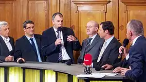Elefantenrunden have taken place before parliamentary elections since the 1969 federal election.[1] These were broadcast live by ARD and ZDF simultaneously, with the official name of Drei Tage vor der Wahl (Three Days before the Election), before the 1972, 1976, 1980, 1983, and 1987 elections. There were no time limits and in 1976 the Elefantenrunde went on for more than four hours.[2] A first attempt to broadcast an Elefantenrunde in 1965 failed.[3] The Elefantenrunde was no longer broadcast as part of the election campaign after 1987, since the serving Bundeskanzler Helmut Kohl refused to participate in such a debate before the federal elections in 1990, 1994, and 1998. Since the 2002 election, there has been a televised debate between the leaders of the two main parties, the CDU and the SDP, which was unsuccessfully challenged in the Federal Constitutional Court.[4] Alongside this, at the 2005 election, there was a debate broadcast on ARD with the leaders of all the parties in the Bundestag a few days before the election, which (unlike the broadcasts up to 1987) had time limits and took a back seat to the debate between the two major parties in public consciousness. A similar broadcast was planned for the 2009 election, but was cancelled due to the refusal of candidates from the CDU and the SPD to participate. On the Sunday before the 2013 election, a 90 minute long "Berliner Runde" (Berlin Round-table) was broadcast in parallel by ARD and ZDF instead, in which prominent supporters of the parties in the Bundestag took part instead of the actual candidates.