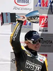 Myers' first AMA Pro Racing victory came during Race 1, Round 4 of the 2010 season of the AMA Supersport Championship (AMA Supersport West series) at Infineon Raceway in Sonoma, California, on May 15, 2010. On lap 10 of 18 scheduled laps, the race was called after being red flagged twice due to crashes, securing first place for Myers.[3][4] The race was not allowed to run its full distance because cleaning up the track and restarting would have put the day's program too far behind schedule.[7] Myers described the time between the first and second red flags by saying, "I got a good restart off the front row and made some moves. I felt like I was getting a little bit closer to the leader with about eight or nine laps to go. I came around the next lap and the red flag was shown again."[5] (The AMA Supersport West series is limited to riders ages 16–21 riding close to stock 600 cc (37 cu in) displacement sport bikes).[3][22]