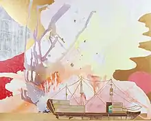 Vivid color palettes and contrasting organic and geometric shapes characterize Condon's work. So too does a deliberate mixing of painting techniques, from careful rendering to loose gesture. Indeed, Condon seems to intentionally defy adherence to any single standard. Forms, places, and times move seamlessly into one another, transformed and organized by a sense rhythm divorced from reality.[2] In her depictions of stacked spaces, history and geography are collapsed. The landscapes depicted are both themselves altered by human interaction, and the ensuing paintings feel like idiosyncratic records of Condon's mind and her imaginings of the space. As one critic puts it: "the result feels like a dream or memory suddenly, if fleetingly, made visible."[3] Viewing Condon's paintings, imbued as they are with this intense personal quality, consequently feels "a bit like reading her diary: strangely disorienting at first, then disarming and familiar."[4]