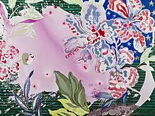 Reexamining her experience from a feminist perspective, she began drawing inspiration from suburban home decor.[19]  She reconsidered her mother's "obsessive decorating" of her childhood home, an aesthetic that had at one time been only a symbol of her family's stifling conservatism, and transformed it into an important element of her work. She now uses vintage wallpaper patterns as a visual element in her work, and recounts asking her mother for leftover wallpaper and fabric samples to use in her studio. The plum blossom in particular is not only of central importance to Chinese art, it also appeared on the wallpaper of her childhood bedroom.[13]