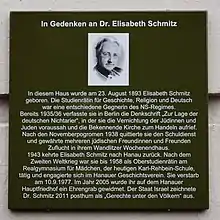 For the 30th anniversary of Schmitz's death, Manfred Gailus organized a 2007 conference in Berlin on Schmitz's life and work. Papers from this conference were published as Elisabeth Schmitz und ihre Denkschrift gegen die Judenverfolgung. Konturen einer vergessenen Biografie (1893–1977).[5] The translation reads "Elisabeth Schmitz and her memorandum against the persecution of the Jews. Outlines of a forgotten biography."