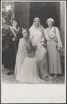 In 1911, Prince George of Greece, then second-in-line to the throne and his future wife's second cousin, met Elisabeth for the first time.[6] After the Balkan Wars, during which Greece and Romania were allied, the Greek prince asked for the hand of Elisabeth, but, advised by her great-aunt, she declined the offer, saying that her suitor was too small and too English in his manners. Disdainful, the princess even said on the occasion, that "God began the prince but forgot to finish him" (1914).[7][8]