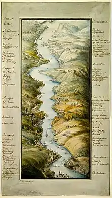 During a cruise on the Rhine in 1811, she drew preparatory sketches for a panoramic painting of the Rhine valley from the mouth of the Nahe to the Moselle.[2] The panorama used continuous parallel projection to illustrate an overhead view of the full Rhine Valley.[1] Johann Friedrich Cotta von Cottendorf (1764–1832) recognized the novelty of this technique of making pictorial maps and initiated the lithographic printing of this sheet by the Stuttgart geographer and cartographer Heinrich Keller in 1822.[2] In 1823, Friedrich Wilhelm Delkeskamp of the Frankfurt publishing company Friedrich Wilmans published this classic panorama of the Rhine from Mainz to Cologne.