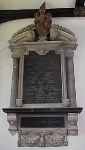 Dame Elizabeth was harassed by lawsuits, though these were eventually decided in her favour. She became deaf in 1675, and after long illness died at Cockfield Hall on 22 July 1683, making provision for Mary to have lifetime custody of her estates and for their eventual descent to Elizabeth's grandson Charles Blois.[43] Her chaplain Nathaniel Parkhurst, vicar of Yoxford where she was buried, preached her funeral sermon. In the following year he published it with a portrait, a Life and an appendix of her writings, dedicating the book to her daughter Mary. Mary arranged for the marble wall monument to be set up in the Cockfield Chapel at Yoxford church, which records the death of both her parents, but devotes most of its inscription to her mother's character and virtues.