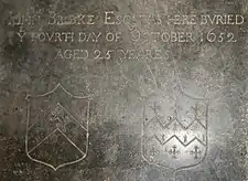 - ↑ His ledger slab in Yoxford church reads: "Iohn Brooke Esq was here buried ye fourth day of October 1652 aged 25 yeares." (M.I.). It has the Brooke crest above (on a chapeau gules turned up ermine, a wing proper charged with a chevron argent thereon a lion rampant sable), the Brooke escutcheon below dexter (gules on a chevron argent a lion rampant sable) and Barnardiston below sinister (azure a fess dancettée ermine between six crosses crosslet argent).