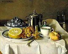 Okie Paxton utilized light, texture, and color like that of other artists of the Boston School.[14] Her painting, Continental Breakfast, was shown at Rowland's in Boston and described on May 17, 1907,