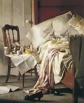 The Breakfast Tray is a provocative bedroom scene. Rather than show pristine interiors typical of the Boston School, however, Okie Paxton depicted a sensual, messy environment, indicating a modern sensibility and sexuality of the occupants. Her work resembled Modernism, rather than the more traditional Boston School.[14] Another modern bedroom scene was used in a Wamsutta sheet advertisement.[17] Her work provided insight into a new emerging woman in the intimate details revealed in the painting: