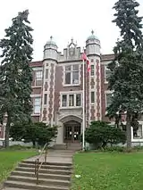 On December 16, 1985, the school building was designated by the City of Waterloo as a heritage landmark under the provisions of the Ontario Heritage Act. The building was built in Gothic Revival style and cost $121,999 to build, a significant expenditure during the Great Depression. The building was three stories tall and originally had 16 rooms, including double-sized rooms for household science, kindergarten, manual training, and assembly. Included in the design of the school was a nod to Waterloo's official flower, the gladiolus, which Warren had carved above the main entrance.[4] Two extensions were later made, one in 1955 and another, consisting mainly of a gymnasium, in 1987.