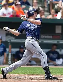 John Romano of St. Petersburg Times wrote in March 2011 that he was likely one of three players competing for two spots on the Rays bench, with the other two being outfielder Sam Fuld and first baseman Casey Kotchman.[2] Johnson made the opening day roster, along with Fuld. On May 15, 2011, he hit his first major league home run against Baltimore Orioles pitcher Jake Arrieta.[3] On August 12, 2011, he was one of 5 Rays to hit solo home runs off CC Sabathia in a 5-1 Tampa Bay victory.[4] Johnson was designated for assignment on February 5, 2013.[5][6] In part of three seasons with the Devil Rays/Rays, he hit .223 with 10 homers and 50 RBI.