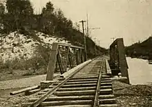 Wherever the line of road crossed the stream there were erected plate girder or through span steel bridges, which were furnished by the Berlin Bridge Co. and the Havana Bridge Co. The bridges were set on foundations of cut stone laid in Portland cement, none but dimension stones being placed in the faces of the walls. The track over all bridges had inside guard rails of the same section as the running rails, laid parallel to and 4 inches (100 mm) from them. The bridges had fender pieces with notches on the underside to receive the ties; the fender pieces were held in place by bolts with washers on each end. Exposed parts of ties and also the notches were treated with two coats of red lead to prevent absorption of moisture.[1]