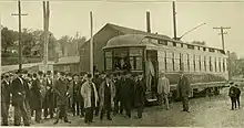The car equipment consisted of 12 cars, four of them similar to that used for the formal opening of the line. Two of these four had smoking compartments, the other two had both baggage and smoking compartments. They were equipped with four G. E. 1.000 motors, K-11 controllers, Christenson automatic air brakes, and Wagenhals arc headlights. The interior was finished in cherry and mahogany; the seats were of the walkover pattern, covered with rattan. They were lighted with four five-light clusters of handsome design; these cars were fitted with electric push buttons. Of the other eight cars, six were open 15-bench cars and two closed 28 feet (8.5 m) cars; they were equipped with Westinghouse motors and G. E. K-11 controllers and had Syracuse changeable headlights. The cars were painted Pullman green with gold striping and each had the name of one of the towns on the route as well as the number. All cars had a tool box containing pliers, wrench, and trolley wire pickup for use in case of emergency repairs, or picking up broken trolley wire.[1]