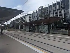 Elouera Street is a light rail station in Australia on the Canberra Metro R1 Civic to Gungahlin line, located at the intersection of Northbourne Avenue, Elouera Street and Gould Street. It is one of two stations serving the suburbs of Turner and Braddon. Bicycle racks are provided for commuters adjacent to the station.[1] The station is close to Lonsdale Street, a popular dining and nightlife strip. Many businesses in this area were heavily impacted by road closures and delays during the construction phase, with a number of public car parks being lost to make way for light rail infrastructure contributing to prolonged accessibility issues.[2]