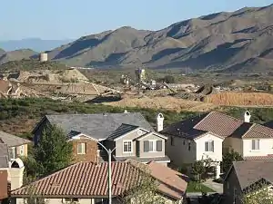 Newly constructed housing tract in the Alberhill Ranch neighborhood. Pacific Clay Products company mine in background.