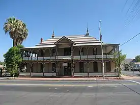 In 1851, Abel Stearns acquired the rancho and sold it in 1858 to Augustin Machado. Augustin Machado built a seven-room adobe ranch house and an outbuilding on the southwest side of the lake. Soon after, Rancho La Laguna became a regular stop on the Butterfield Overland Mail route between Temecula 20 mi (32 km) to the southeast and the Temescal station 10 mi (16 km) to the northwest. The old Manriquez adobe was used as the station house. Over the years, a framed addition and a second story were added, and it was used as a post office for the small settlement of Willard from 1898 until September 30, 1902. The building stood until it was razed in 1964, at what is now 32912 Macy Street. Today, three palm trees still grow in front of the site along Macy Street in front of the property.[11][12]