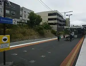 In 1915, an electric tramline between Elsternwick and Point Ormond opened. It closed on 22 October 1960, after which the tram route became part of an extended 246 bus route. In February 1959, a project commenced to eliminate the Glen Huntly Road level crossing, where a tramway also crossed the rail line. A temporary two-track station was provided in a side street parallel with the station, which allowed rail services to continue uninterrupted. In October 1960, the work was completed, which was when the present railway buildings were provided.[6][7][8]