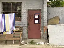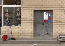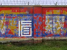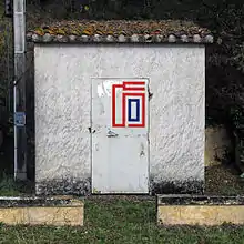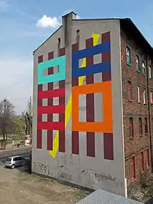 Eltono is a French artist born in the suburbs of Paris in 1975.[1] His work is mostly influenced by his graffiti background.[2] He started painting around 1989[3] in his neighborhood[4][5] mostly on train tracks and highway walls. "Eltono focused mainly on the railway lines to the northwest of the city, painting in the traditional silver and black, block letter Parisian style."[6] He lived in Madrid from 1999 to 2010 (where he got his pseudonym[7]), then in Beijing[8] from 2010 to 2014 and since 2014 lives in the south of France.[9] In 1999, while living in Madrid, he started painting abstract symbols with tape and acrylic paint.[10] "It was then that he developed the colorful geometric box patterns for which he is now known."[11] "As Eltono himself suggested, his move away from traditional graffiti was produced so as to find a harmony with both the material and the social body of the city (integrating both its architectonic and societal elements in a more consensual manner)."[12] "Eltono also rejects conventional letterforms in favor of a minimalism device with which to negotiate space."[13]