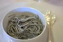 Elvers were also a popular foodstuff in the Basque Country in Spain. Since 1991 a Spanish company has produced imitation elvers, known in Spanish as La Gula del Norte ("The Gluttony of the North") and in English as el-vers, from surimi fish paste.[9][12] The fish used include Alaskan pollock and Pacific whiting.[9] An eating contest with the el-vers was trialed at the 2014 Frampton Country Show, held at Frampton Court and attracting around 14,000 attendees.[11] The event was well received and since 2015 the Elver Eating World Championships have been held on an annual basis (excluding the period interrupted by the COVID-19 pandemic) at the fair, on the Early May bank holiday.[13][12] As with the trial event, actual elvers are not eaten, the surimi-based product being used instead.[12] As well as the traditional competitions for men and women, a competition for children, using spaghetti, is held.[2]