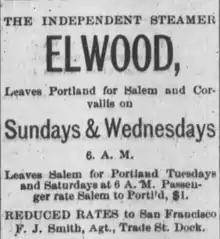 14. 1 2 3 4 5 Smith, F.J. (April 5, 1894). "The Independent Steamer Elwood … (advertisement)". Capital Journal. Salem, OR. p. 3 col. 4.