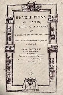 Loustallot left Bourdeaux and arrived in Paris in 1787. The year 1788 marked the largest crop failure in France in the 18th century, exacerbating pre-existing tensions. During this time, Loustallot worked in the authorship and translation of pamphlets. On June 17, 1789, the Third Estate voted in the Hotel des Menus Plaisirs 490-90 to form the National Constituent Assembly.[4] This act is taken to mark the political birth of the French Revolution.[4] Shortly thereafter, J. L. Prudhomme founded and financed the Revolutions of Paris, where Loustallot joined as the founding editor and a major author. Loustallot's Revolutions of Paris printed its inaugural issue on July 17, 1789, three days after the sans-culotte rebels succeeded in storming the Bastille. In its first fourteen months of publication, he personally wrote the first sixty issues of the newspaper.[1] In 1790, with the recent lax in censorship laws and the tide of revolutionary sensationalism, Paris had 133 journals being published.[5] The Revolutions of Paris was considered to be among the most distinguished and impartial of the lot.[1][2]