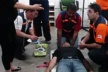 ![]() An emergency care instructor teaches the use of a defibrillator | |