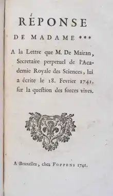 In 1741 du Châtelet published a book titled Réponse de Madame la Marquise du Chastelet, a la lettre que M. de Mairan. D'Ortous de Mairan, secretary of the Academy of Sciences, had published a set of arguments addressed to her regarding the appropriate mathematical expression for forces vives. Du Châtelet presented a point-by-point rebuttal of de Mairan's arguments, causing him to withdraw from the controversy.[30]
