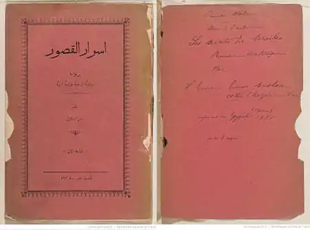 - ↑ Arslan, Emin (1897). Asrār al-quṣūr: riwāyaẗ siyāsiyyaẗ tārīẖiyyaẗ ġarāmiyyaẗ adabiyyaẗ [The Secrets of the Palaces – Political, historical and romantic novel] (in Arabic). Cairo. Retrieved 17 March 2017.