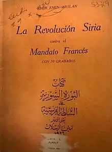 In June 1926, Arslan founded Al-Istiklal (الإستقلال), The Independence. The magazine was in Arabic but part of its commercial ads were in Spanish. It came into being as a political and intellectual response to the upheaval caused by the Great Syrian Revolt,[41] and was one of the main Arabic anti-French organs from Argentina/Brazil. Moreover, it represented a particular strand within local pan-Arab/nationalist anti-colonial thought and activism.[42]