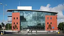 Emlyn Hughes House is a landmark four-story office building located at the intersection of Abbey Road and Holker Street in Barrow-in-Furness, England. It is named after local footballer Emlyn Hughes who captained both Liverpool F.C. and the England national team, a statue of Hughes is also located outside of the building.[1] Emlyn Hughes House replaces the Art Deco Ritz Cinema and was designed by Bowker Sadler architects and built by Capita Symonds for Barrow Borough Council. There was much speculation that the development would become a 'white elephant' because a year after completion in 2008 the whole building remained vacant.