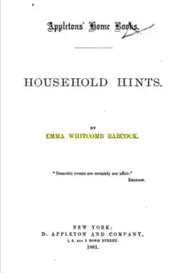 Emma Whitcomb Babcock (née, Whitcomb; April 24, 1849 1926) was an American litterateur and author. [1] She did considerable work as a book reviewer, and contributed to various leading magazines. She was the author of Household Hints, a domestic management guide, and A Mother's Note Book, as well as other works.[2] She was president of The Belles-Lettres club, well known in western Pennsylvania, which founded a public library.[3][4] Babcock died in 1926.