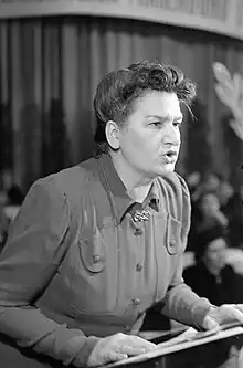Until 1934, she worked as a full-time volunteer for the district leadership of the Berlin-Brandenburg KPD, first as a political worker and then as leader of the women's division.[1] After the Nazi Party seized power in 1933, the KPD and other opposition parties were outlawed, making such work illegal. In 1934, learning that she was on a Gestapo list,[2] she went to Moscow and worked in the Women's Secretariat of the Communist International. In 1935 and 1936, she attended the Communist University of the National Minorities of the West in Moscow using her cadre name, Emmy Dublin. She had been living with Leo Scharko, a Polish communist.[3] In 1936, he was arrested in the Great Purge and came back a few weeks later, humorless and tense. Although he didn't reveal much about his confinement, Damerius-Koenen apparently deduced he had agreed to denounce others. After the university was closed, she was sent to work with the Party leadership in Paris, Prague and Zurich. From Paris, she and Scharko corresponded, although with precautions such as invisible ink and cover addresses.[3] Learning that the verity of Scharko's academic background was being challenged because of a lack of documentation in his cadre file, she managed to acquire a copy of the missing degree, which she forwarded to Scharko. Rather than prove his credentials, however, the document was taken as substantiation that Scharko had connections in Nazi Germany, a deadly serious charge in the Soviet Union at that time. As Damerius-Koenen later wrote, "Since 1937, there has been no trace of Leo Scharko."[3]