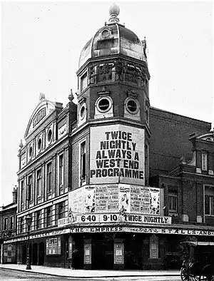 The Empress Theatre was built for Messrs W. H. Burney and W. J. Grimes and was designed by Wylson & Long and built by the contractor T. L. Green. The Empress could seat 1,260 on three levels, stalls and pit, Dress Circle and Gallery, and had a large stage 60 foot wide by 40 deep with a proscenium opening 30 foot wide. The electric lighting and heating was installed by Messrs Strode and Co.. The box-office hall was decorated with marble mosaic by Messrs Diespeker and Co., and was fitted with Japanese leather decorations. The auditorium, decorated in the French Renaissance style, was fitted with 'chaste embellishments' of nine panels 'each ornamented by a heraldic dive of griffins.. clawing a shield in delicate pink'[3] measured 75 foot by 64 foot in the clear over which was a "lofty saucer-shaped dome". Over the proscenium, on each top corner, were positioned reclining female figures of Euterpe and Terpsichore, while over the two boxes, placed on each side of the proscenium on the dress circle level, were paintings, again in the French Renaissance style. The Empress opened on Boxing Day 1898 with a variety show. The Music and Theatre Review of 30 December 1898 recorded that on the theatre's opening night hundreds of patrons were turned away. On the 'bill' that night were Brixton's Kate Carney as well as a display of the Thomas Edison moving pictures.[4] The singer and comedian Arthur Lloyd appeared here in 1900, 1901 and 1902.[1] Other performers to appear at the Empress at this time included Joe Elvin, Vera Lynn, Tommy Fields,[5][6] Wilson, Keppel and Betty,[2] Marie Lloyd and Harry Lauder.
