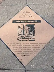 The Empress Theatre is a historical landmark located in downtown Vallejo, California built in 1911. It was re-opened in 2008 after nearly 20 years of disuse following the 1989 Loma Prieta earthquake. The one room movie house has undergone complete renovation and seismic retrofit. Operated as a non-profit, it now shows movies, hosts live performances, and is rented for private events.