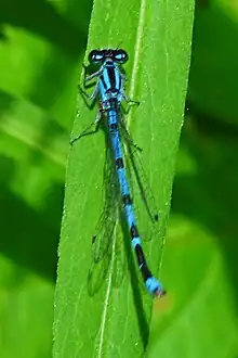 Many species in the genus Enallagma look similar to each other. The northern bluet looks similar to many bluet species.[2] They include the boreal bluet, familiar bluet, Hagen's bluet, marsh bluet, and vernal bluet. It can be distinguished from familiar bluet by the large postocular spots and the shorter cerci. The characteristics shared by northern and boreal bluets are their large eyespots, and a mushroom-shaped black spot on abdominal segment S2. Its best seen dorsally.