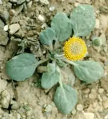 Encelia nutans is a shrub up to 25 cm (10 inches) tall, with swollen roots up to 10 cm (4 inches) in diameter. Leaves are small and green, egg-shaped, rarely more than 5 cm (2 inches) long. Flower heads are produced one per stem, with yellow disc florets but no ray florets.[5][6][2]